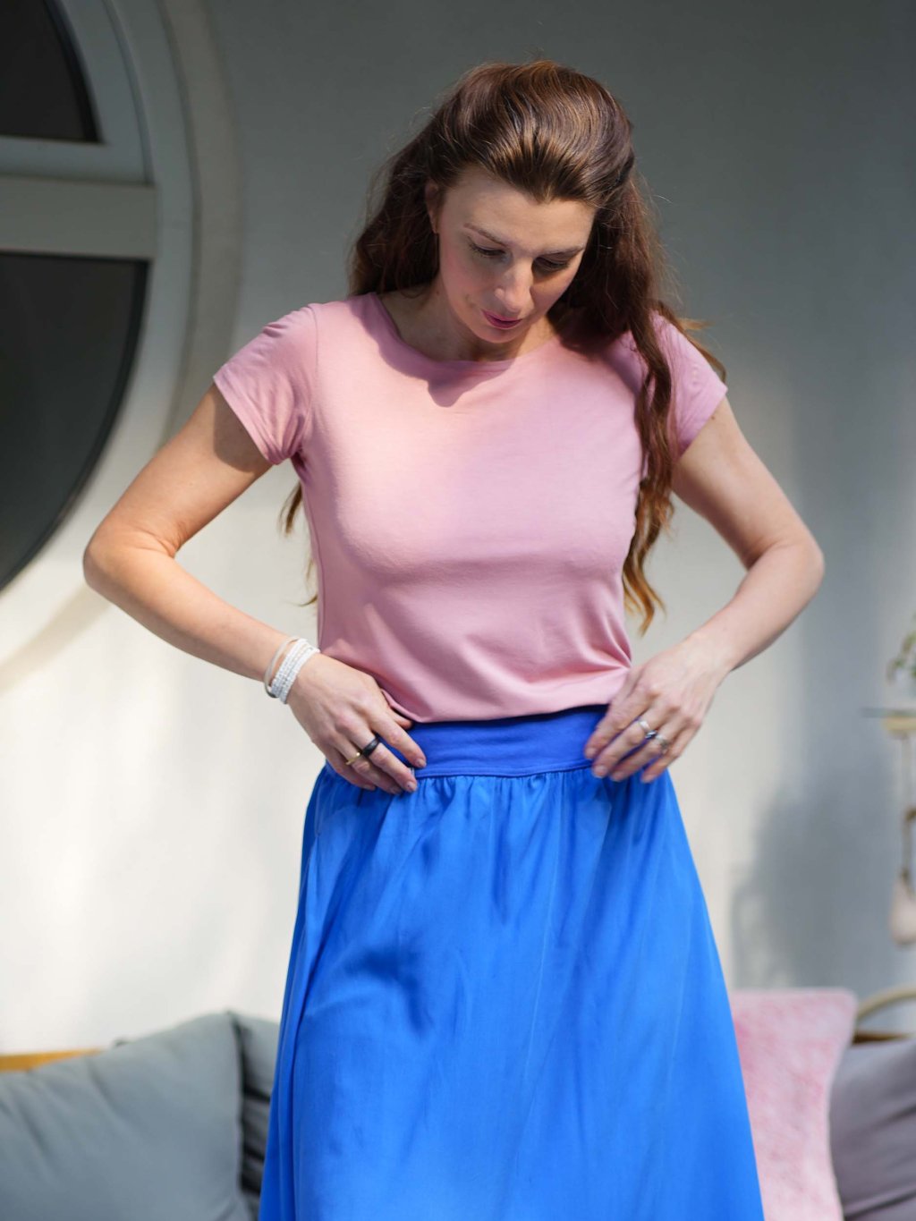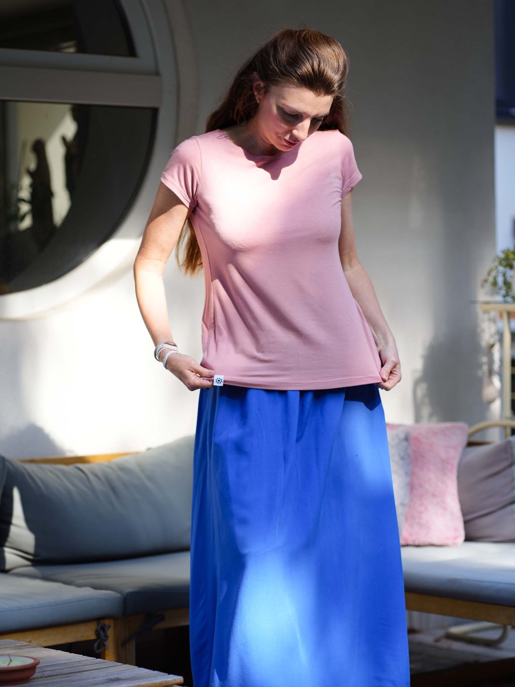Starorůžová barva dodá outfitu romantický nádech a skvěle se kombinuje s neutrálními tóny i výraznějšími barvami. Modelka má k triku naše šortky s kapsou v cappuccino odstínu. Triko můžete také krásně kombinovat s našimi pohodlnými kalhotami z bambusové viskózy Gaia.