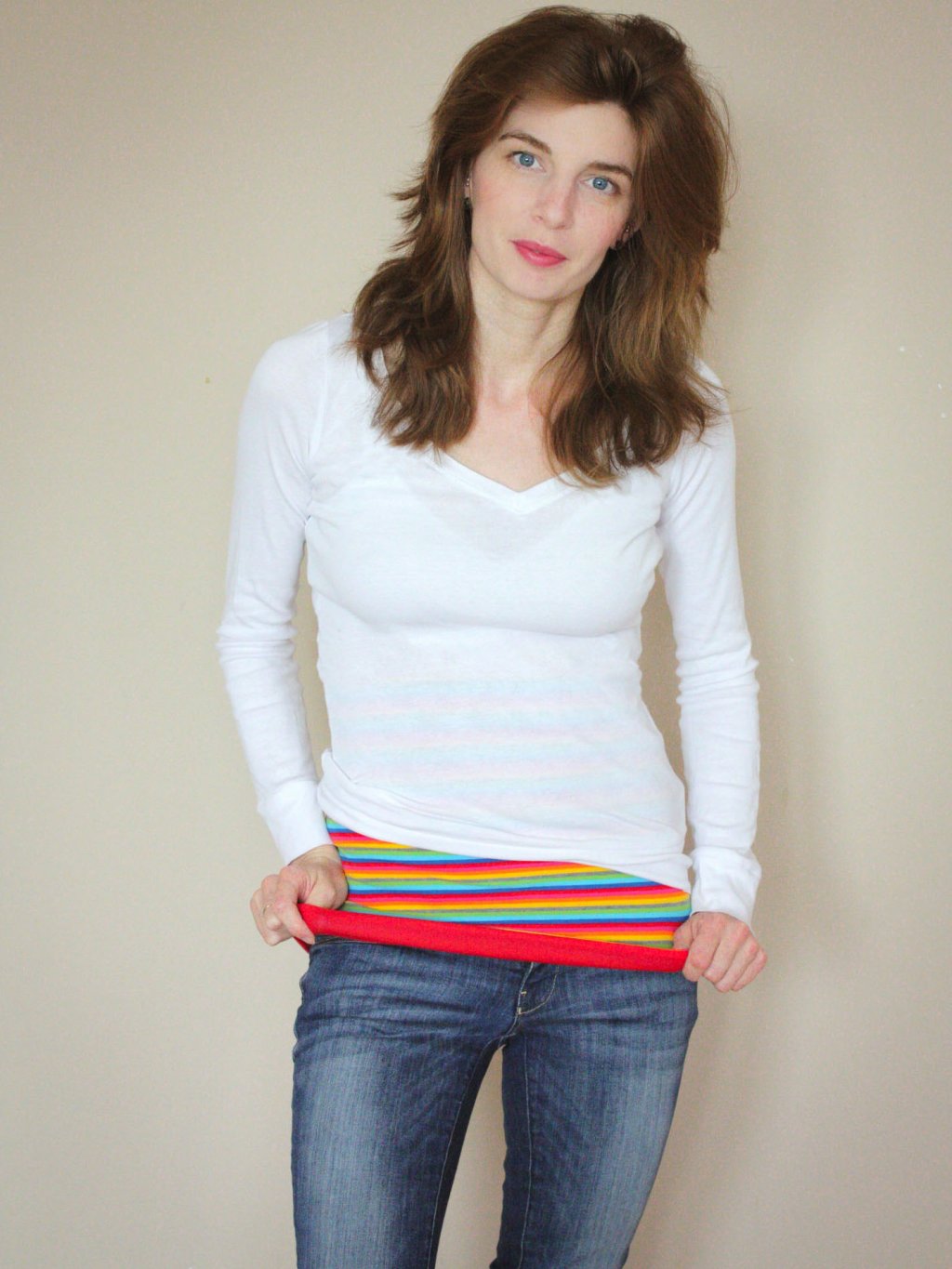 Bederní pás NiceBelly je dvouvrstvý. Barva svrchní vrstvy pásu je vzorovaná (duhová) a vnitřní strana je červená. Můžete ho tedy skvěle kombinovat s různým oblečením.