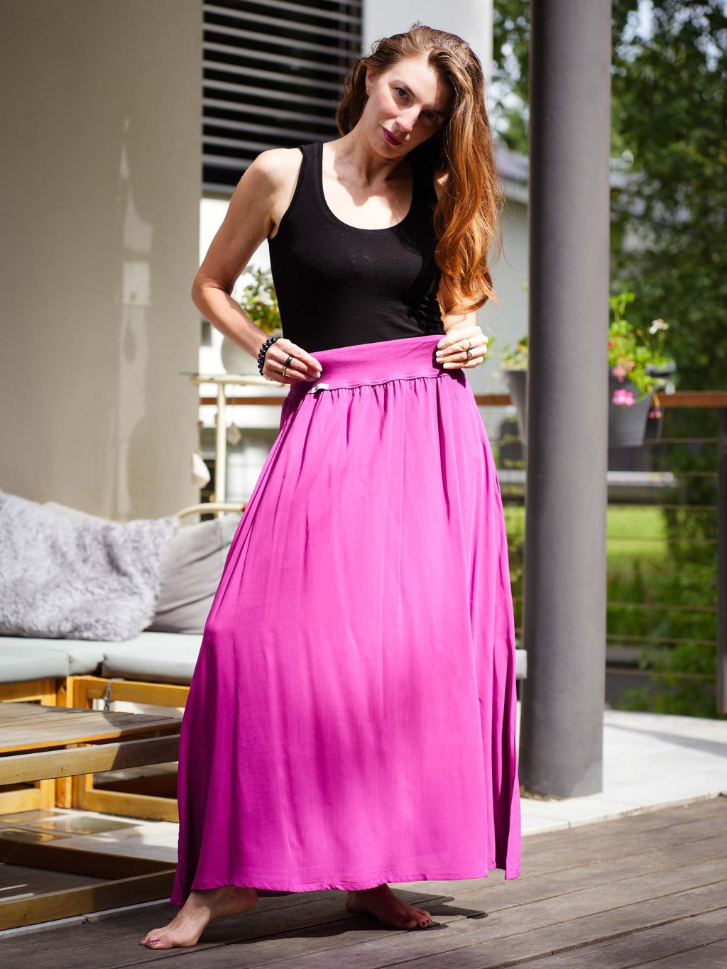Pohodlná maxi sukně s kapsami je ideální na každé příležitosti. Ušitá je ze vzdušné 100% viskózy. V pase má širší náplet z úpletu se všitou gumičkou.