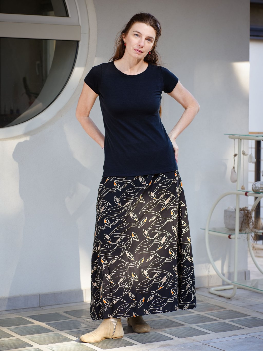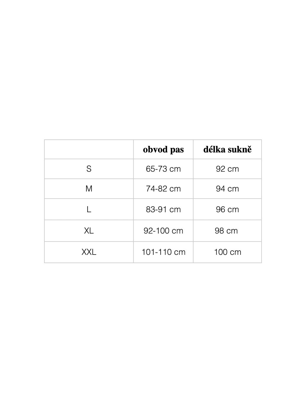 Pro výrobu sukní používáme 100% přírodní viskózu. Srážlivost přírodní viskózy cca 4 cm na délku sukně. Náplet je z úpletu 95 % bavlna 5 % elastan. Certifikace materiálů: Oeko-tex Standard 100.