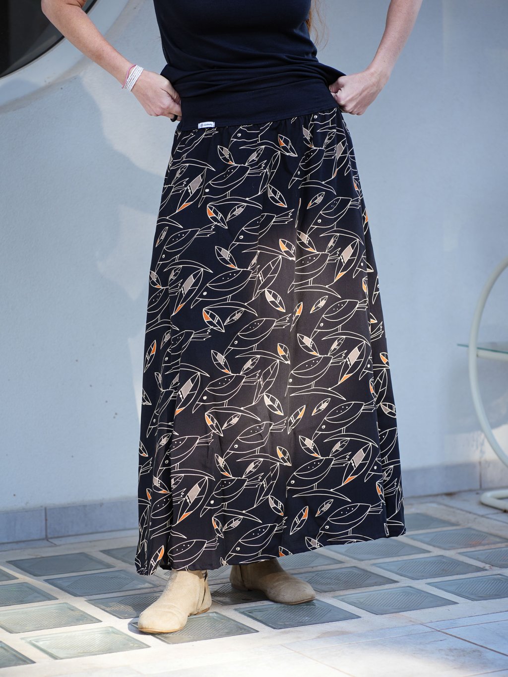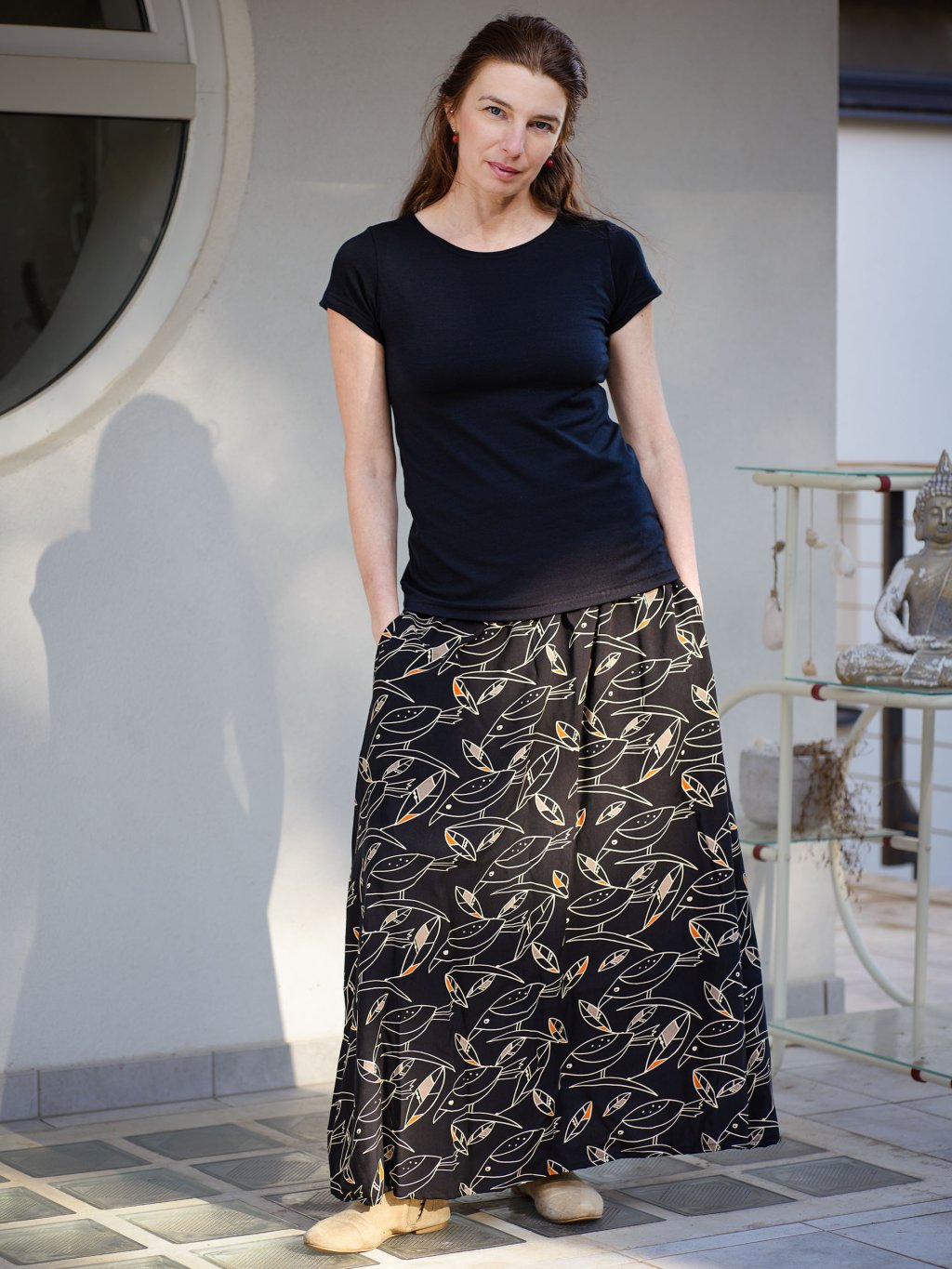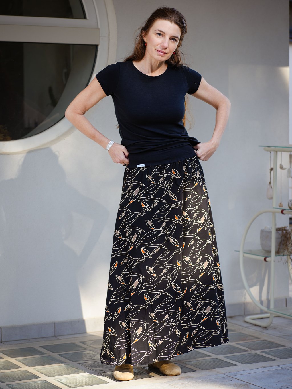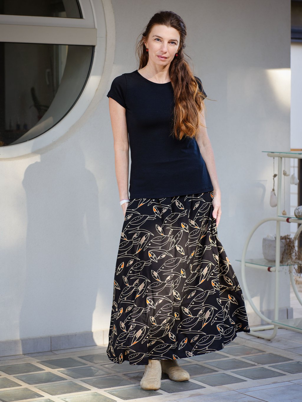 Pohodlná maxi sukně s kapsami je ideální na každé příležitosti. Ušitá je ze vzdušné 100% viskózy. V pase má širší náplet z úpletu s všitou gumičkou.