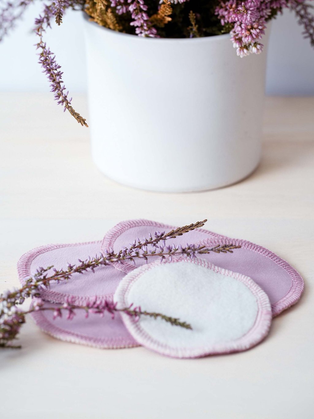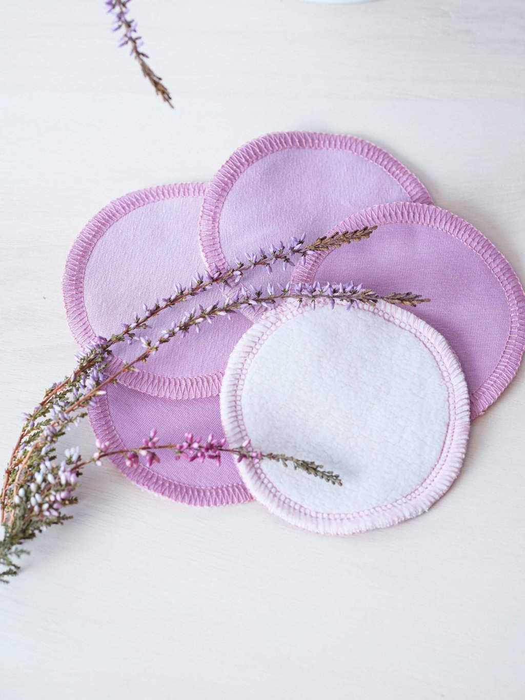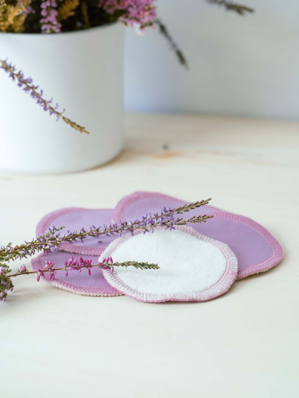 Odličovací pratelné tamponky jsou jemné a šetrné k pokožce. Jsou dvouvrstvé. Odličovací vrstva je 100% biobavlněného beránka smetanové barvy, druhou vrstvou je biobavlněný úplet v borůvkové barvě.