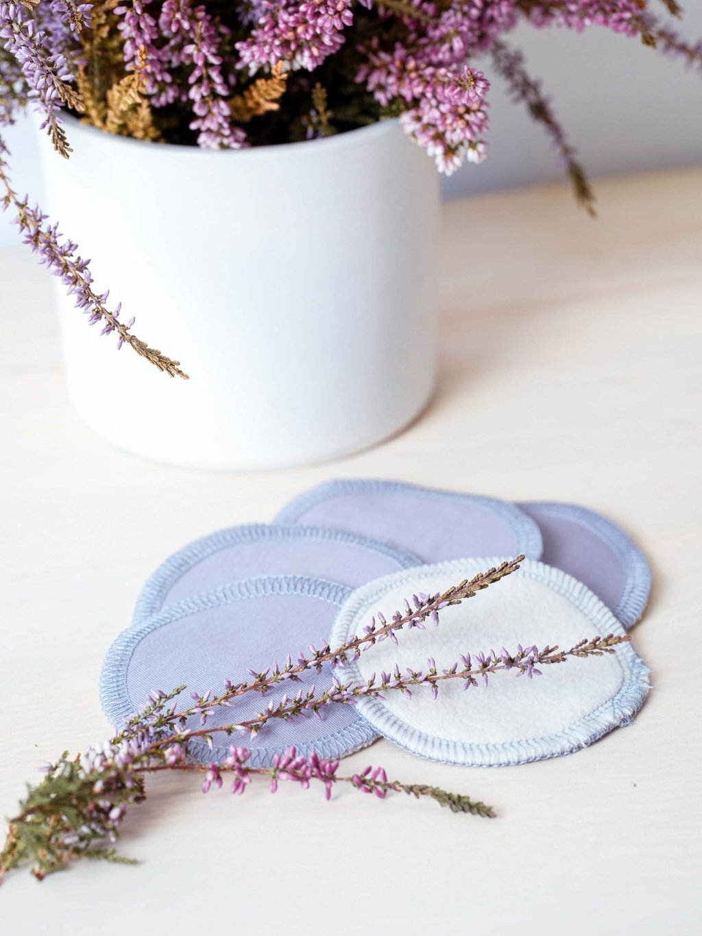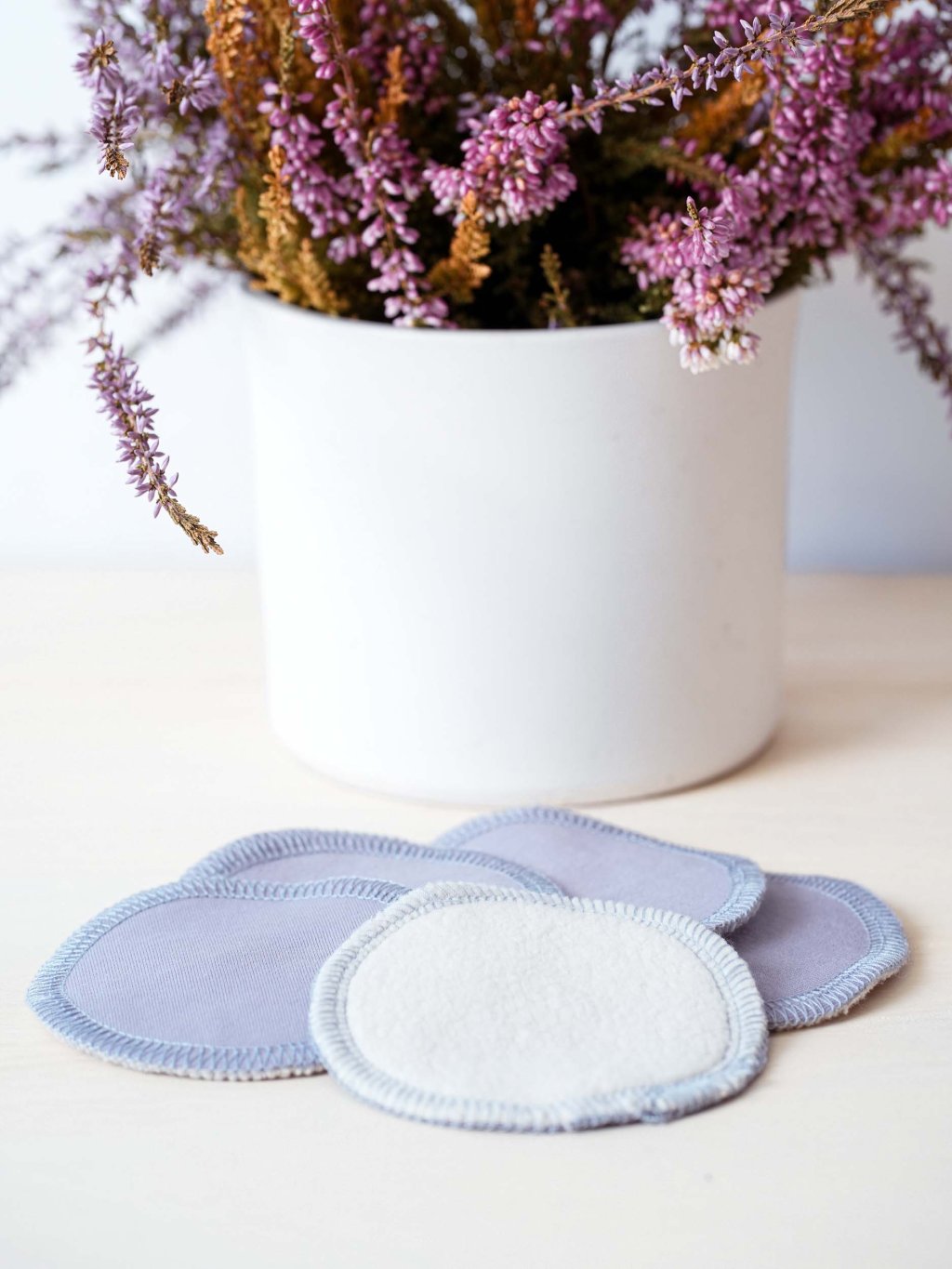 Odličovací pratelné tamponky jsou jemné a šetrné k pokožce. Jsou dvouvrstvé. Odličovací vrstva je 100% biobavlněného beránka smetanové barvy, druhou vrstvou je biobavlněný úplet v modrošedé barvě.