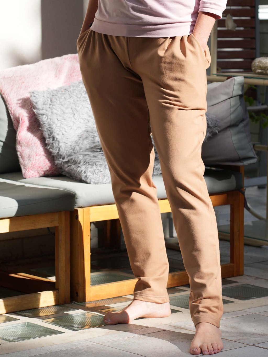 Kalhoty mají v pase pro větší komfort náplet z úpletu a všitou tenkou měkčenou pruženku (0,5cm). Jsou tím pádem velmi pohodlné a v pase pěkně sedí. Do kapes se vám vejde vše potřebné včetně klíčů i telefonu. Na přání lze ušít i variantu bez kapes.